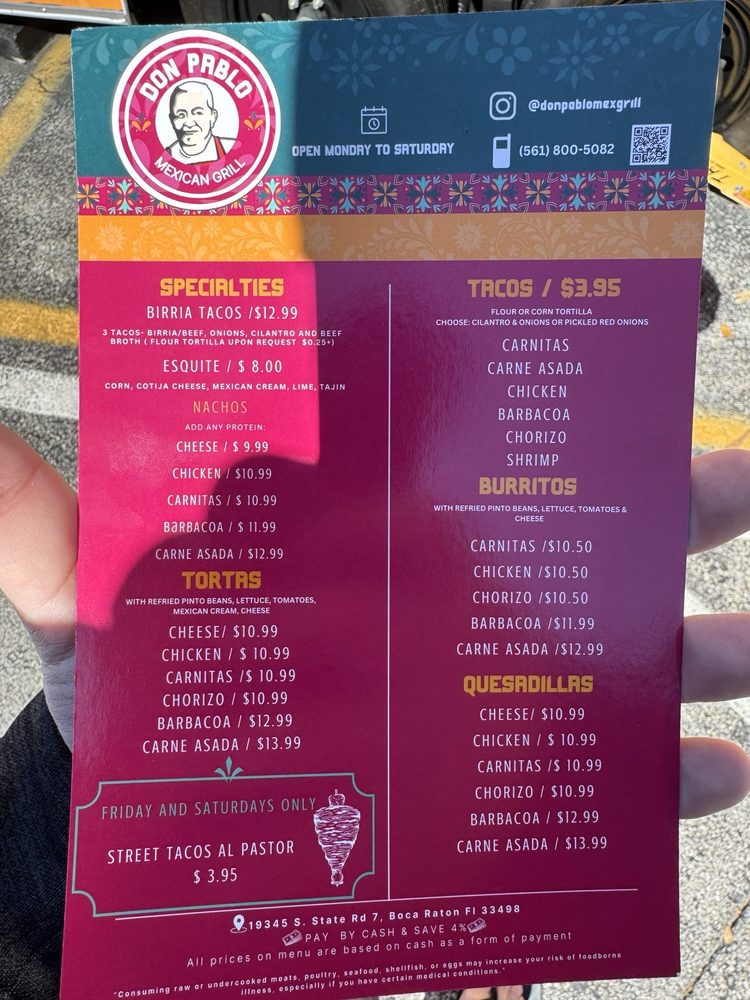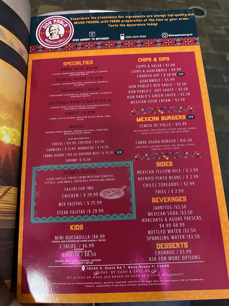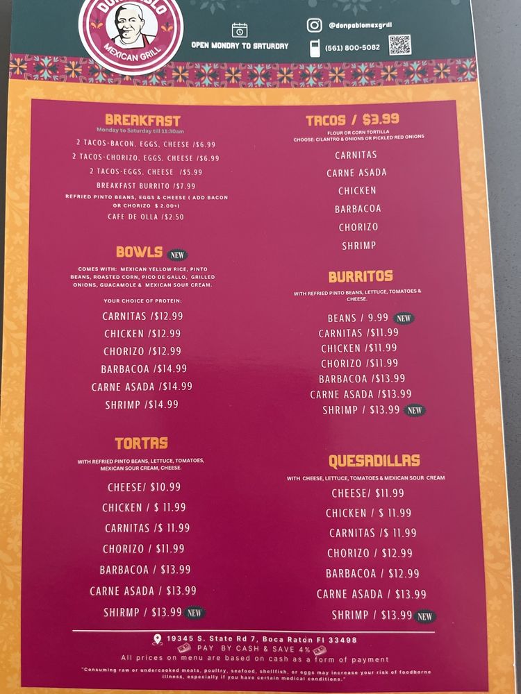 Welcome to Don Pablo Mexican Grill, a hidden gem nestled at 19345 FL-7 in Boca Raton, FL. This vibrant food truck offers a taste of authentic Mexican cuisine that is both flavorful and satisfying. The menu is a delightful array of options, including the beloved Breakfast Burrito featuring refried pinto beans, eggs, and cheese, perfect for kickstarting your day.